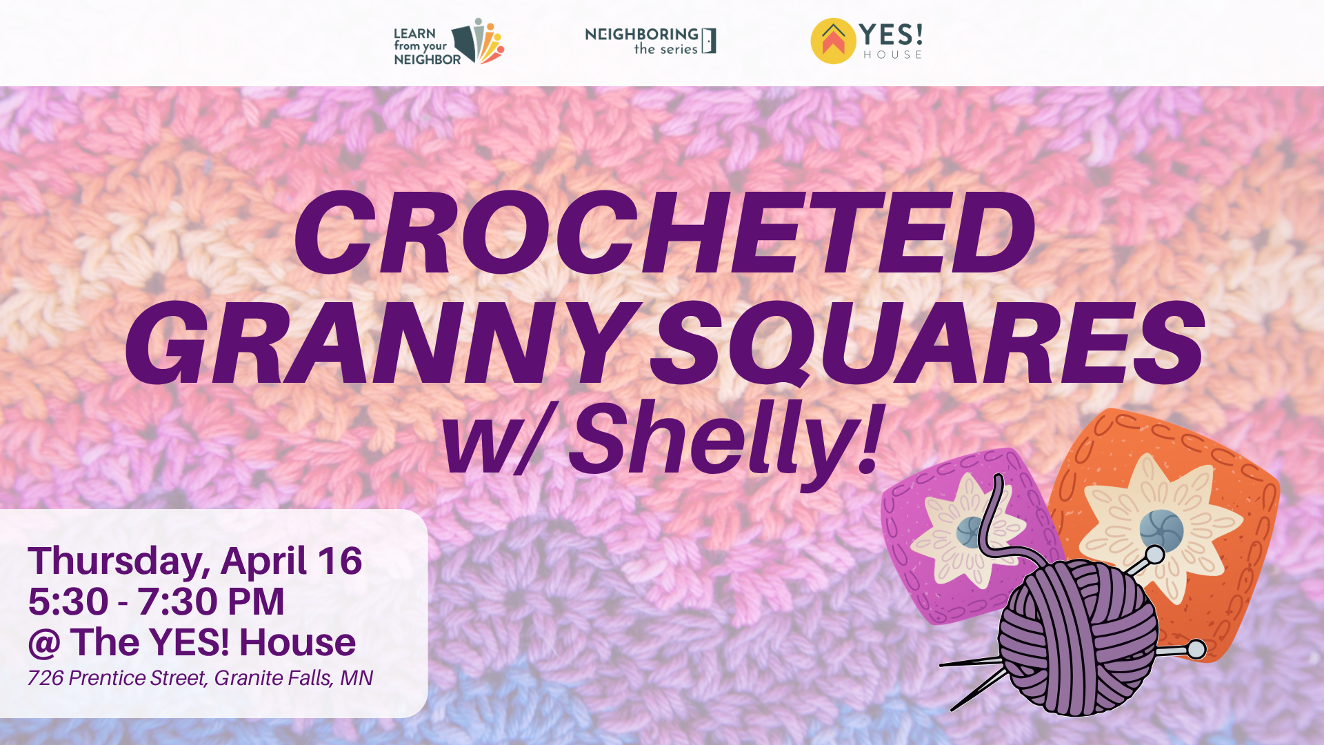 Join Shelly at The YES! House for April's Learn From Your Neighbor Event on Thursday, April 16 to learn how to crochet Granny Squares!