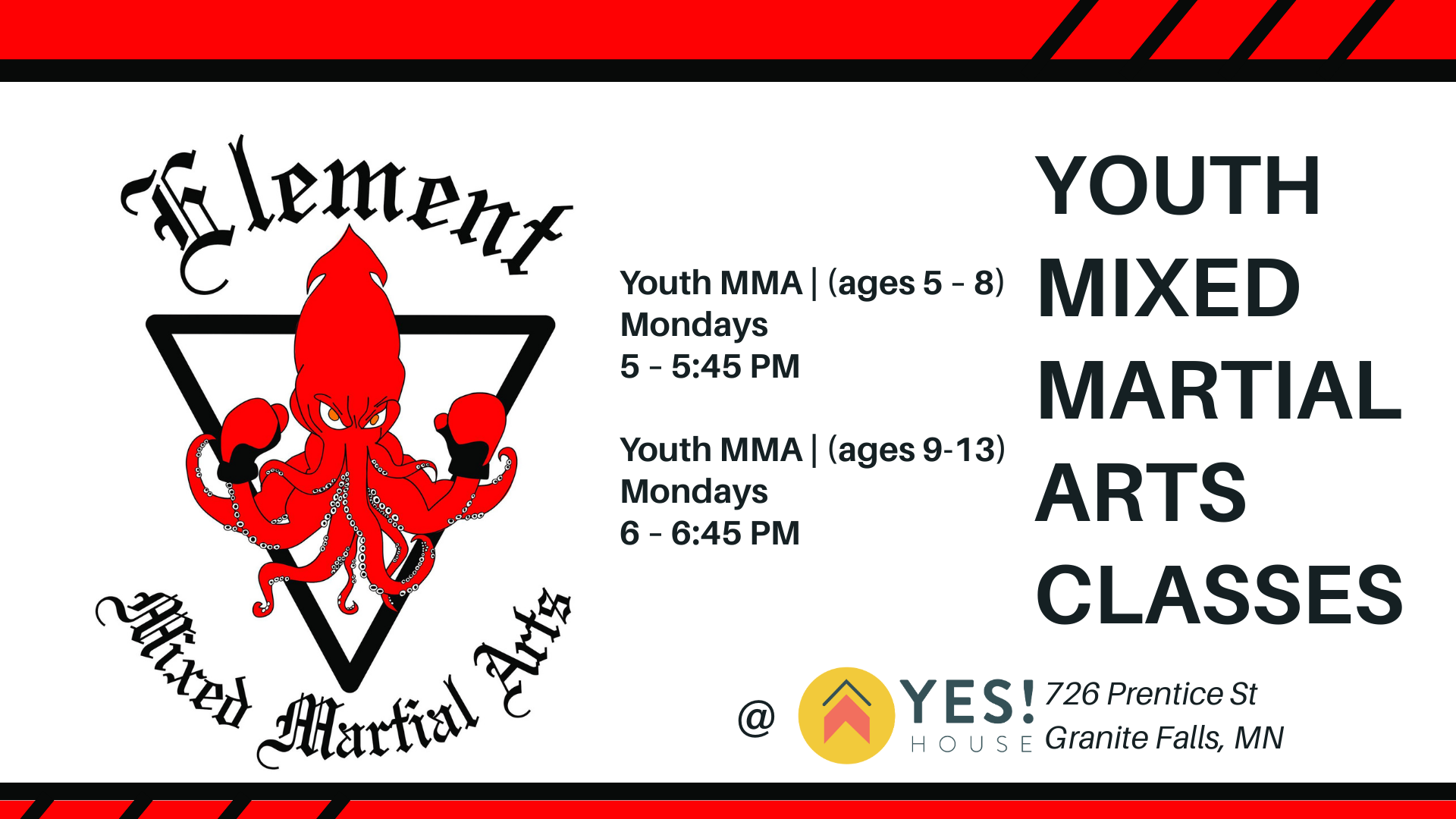 Element MMA will be continuing to teach youth MMA classes weekly every Monday at The YES! House!