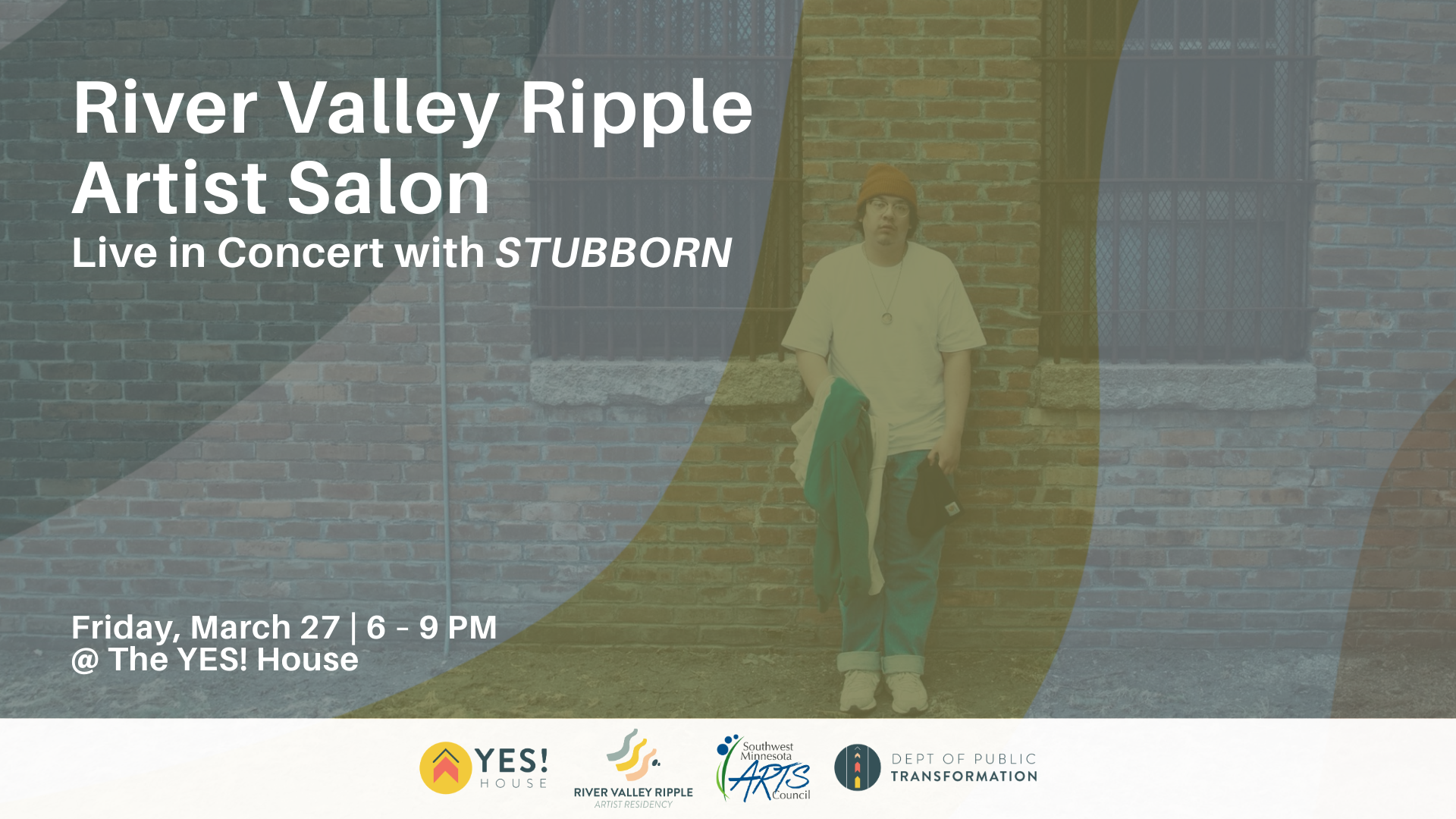 Join us at The YES! House on Friday, March 27th for Walker Peterson's River Valley Ripple Artist Salon: Live in Concert with STUBBORN! Doors open at 6 PM with a social hour where guests can mingle and enjoy appetizers and beverages.