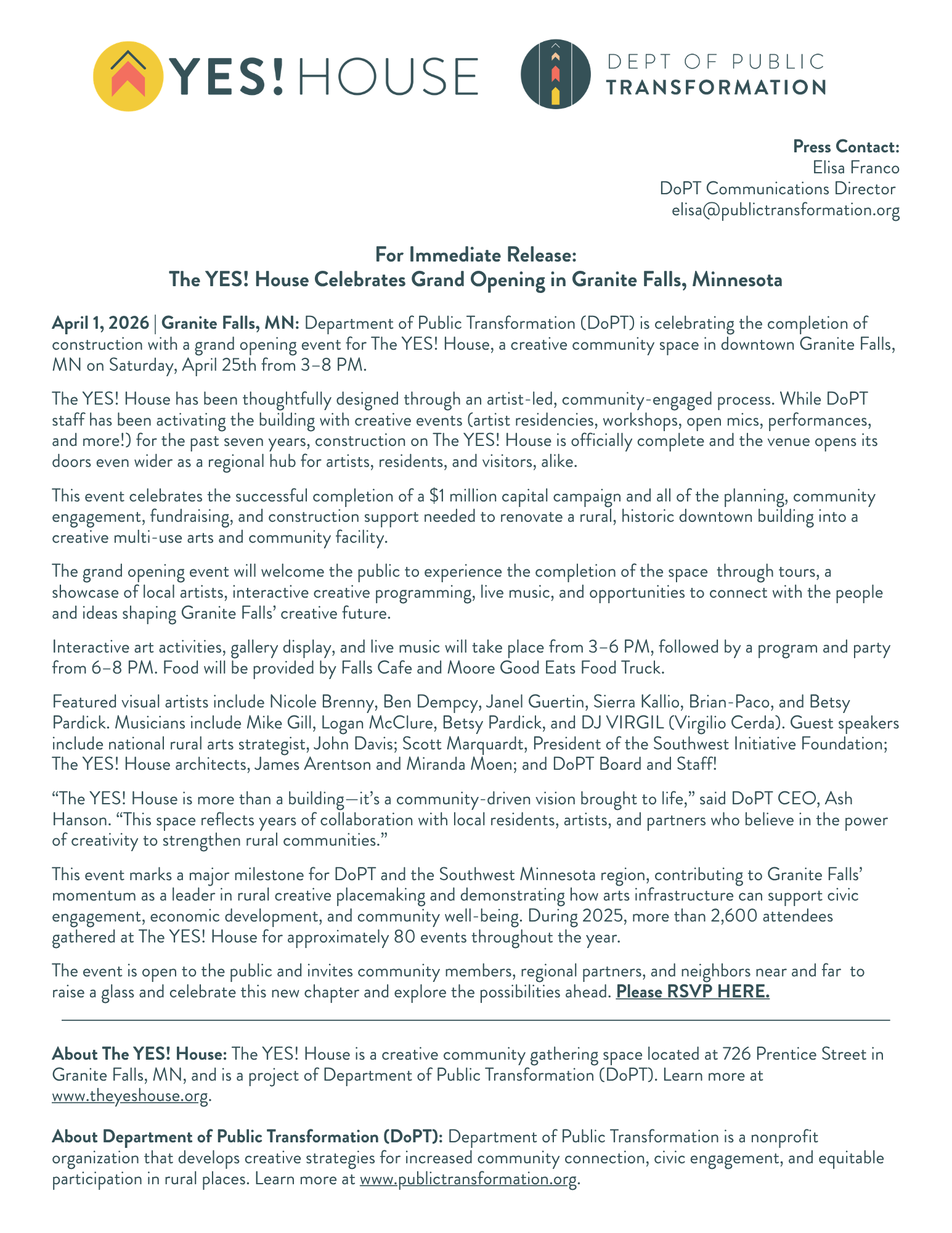 About The YES! House: The YES! House is a creative community gathering space located at 726 Prentice Street in Granite Falls, MN, and is a project of Department of Public Transformation (DoPT). Learn more at www.theyeshouse.org.
